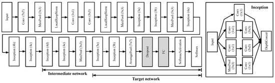 In Figure 1, the pre-trained GoogLeNet is partially retrained using the new set of wavelet images of the intermediate domain to obtain the intermediate network model. The earlier layers extract the common features of images, such as blobs, edges, and colors, while the later layers concentrate on more explicit features to classify data sets. Thus, the parameters of the few later layers of the network are only updated using the intermediate samples as the training data set. Moreover, we set the learning rates of several initial layers of the pre-trained network model to zero. By doing this, the learning speed improves, since the gradients of the fixed layers do not need to be computed. In GoogLeNet in Figure 2, we freeze the first 14 layers, including the inception (4c), while we retrain the rest of the layers from the inception (4d) module. To prevent overfitting, we add the dropout layer after the last average pooling layer of the network. The dropout layer randomly assigns the input component to zero with a certain probability. The last fully connected layer is customized to the intermediate domain.