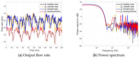 Figure 4 depicts the output flow rate and the power spectrum of the healthy state and three different types of a single fault, and , as shown in Table 1. The faults and correspond to the single fault type due to cylinder leak, blocked inlet, and increased bearing friction, respectively. Note that the unit of the volumetric flow rate is the liters per minute (lpm). We set the severity level for all faults.