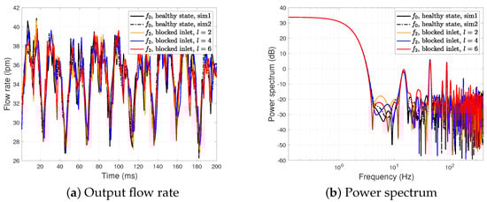 Next, we analyze how the severity level of the fault condition affects the signal in both the time and frequency domains. Figure 5 presents the output flow rate and the power spectrum of the healthy state and the blocked inlet fault with different severity levels . We also report two output flow rates of the healthy state due to different noise realizations.