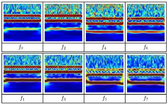 Let us consider the wavelet images of and where these faults are related to the bearing friction fault , as described in Table 1. The combined fault between the blocked inlet and bearing friction, , is hard to differentiate from the single bearing friction fault due to its minor effect on the blocked inlet. However, the cylinder leak heavily affects the overall wavelet images of and . Thus, the effect of the fault combination is not always obvious due to complex interactions between the different faults.