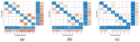 Figure 7 shows the confusion matrices of three classification models, namely, SVM, the CNN, and CNN–TL with . It summarizes the fault diagnosis results of each fault type, including the healthy state and faulty states . We set the severity level as the fault condition of each fault type. The longitudinal and transverse axes present the true and predicted labels, respectively. The diagonal entries indicate the number of correctly predicted fault types, while the off-diagonal entries are the number of incorrectly predicted fault types. A normalized row value (resp. normalized column value) shows the percentages of correctly and incorrectly classified observations for each true class (resp. each predicted label). Overall, the classification accuracy of the CNN–TL is , which is higher than and of SVM and the CNN, respectively.
