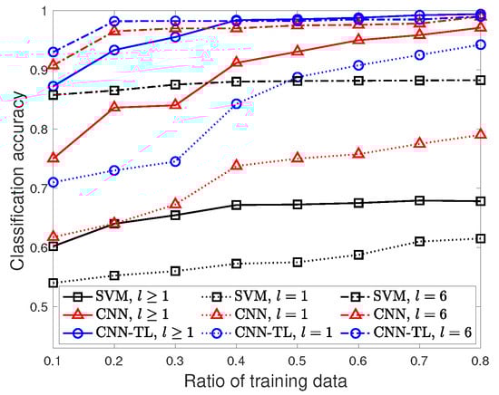 Another interesting observation is that adding more training samples does not considerably improve the classification accuracy of SVM, while it still improves the performance of the CNN. The classification accuracy of the CNN is closer to that of SVM for when the training data is small . On the other hand, CNN–TL achieves a high accuracy of greater than for , even with the strictly limited samples .