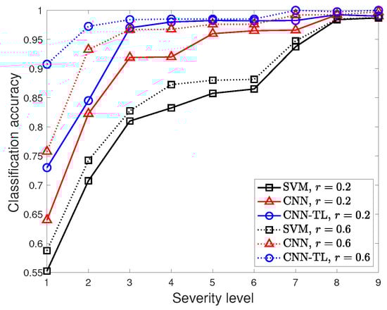 Classification accuracy of SVM, the CNN, and CNN–TL with different severity labels, .