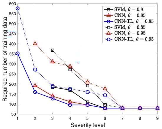 Required number of training samples of SVM, the CNN, and CNN–TL with different severity labels, .