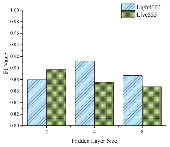 The experimental results show that the corresponding relationship between the classification performance and hidden layer size varies slightly for different test objects. For LightFTP, when the hidden layer size is 4, the F1 score reaches its highest value, and the test case filter has the best classification performance. In contrast, for Live555, the F1 score reaches its highest value, and the test case filter has the best classification performance when the hidden layer size is 2.
