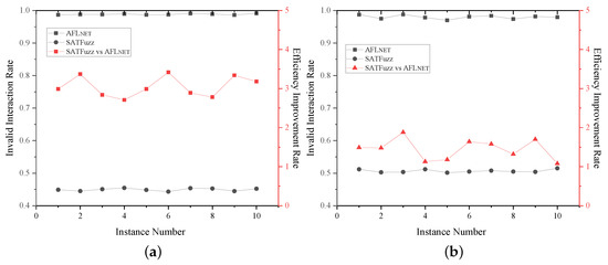 Figure 7a,b show that, for LightFTP and Live555, the vulnerability discovery efficiency levels of SATFuzz were 3.05-times and 1.45-times higher than those of AFL