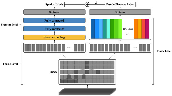 Some research introduced speech information into the TD-SV system based on a multi-task learning approach. On the one hand, speaker adaptation technology is widely used in speech recognition to improve recognition accuracy, indicating that human vocal features are reflected in pronunciation information [2,3]; on the other hand, the performance of TD-SV with fixed speech content is significantly better than that of TI-SV [4], indicating that changes in pronunciation content also have an impact on the vocal features. Therefore, consideration of both vocal and pronunciation feature in speech will help to improve the effectiveness of the speaker representation.