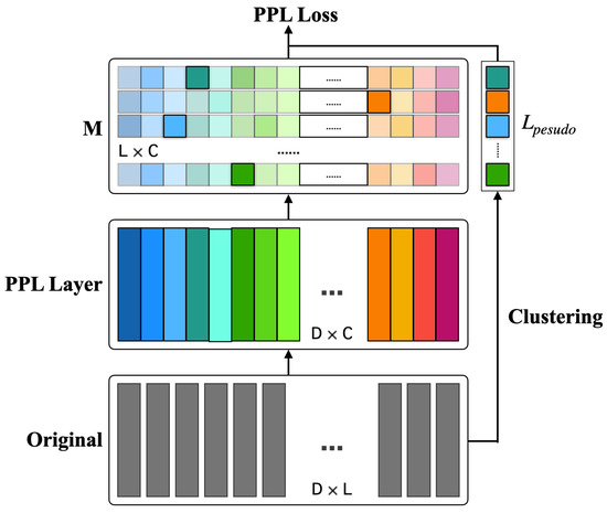 The cluster loss is calculated as follows: we feed the deep neural network with acoustic features, and then the output before the pooling layer is noted as the frame-level feature , , where l is the number of feature frames, and the feature dimension of each frame is D. represents the dimensional feature vectors output from the TDNN layer. We use unsupervised clustering methods to obtain the pseudo labels by setting the number of categories, performing the deep cluster method on the frame-level features to obtain the corresponding categories and computing by combining the similarity matrix M with the pseudo-label , where the number of corresponding categories is the pseudo-label . Each mean vector is taken as a cluster center, where , c is the number of class centers and D is the dimension. Subsequently, we calculate the distance between frame-by-frame features and class centers to get the similarity matrix , with dimension , in order to finish the loss calculation.