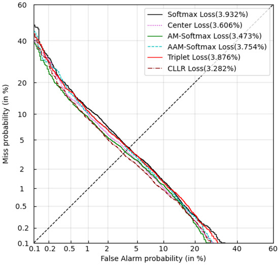 We compared the performance of several loss functions. We took equal error rate (EER) and minimum detection cost function (minDCF) as the experimental performance evaluation index.