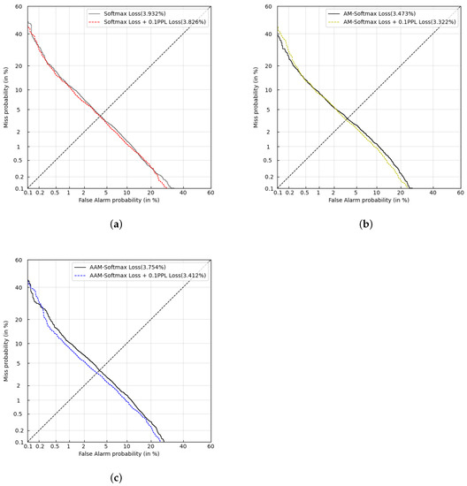 DET curve for VoxCeleb test results of add PPL loss to different loss functions. (a) CE & CE + PPL; (b) AM & AM + PPL; (c) AAM & AAM + PPL.