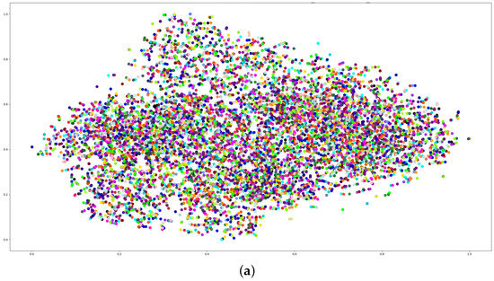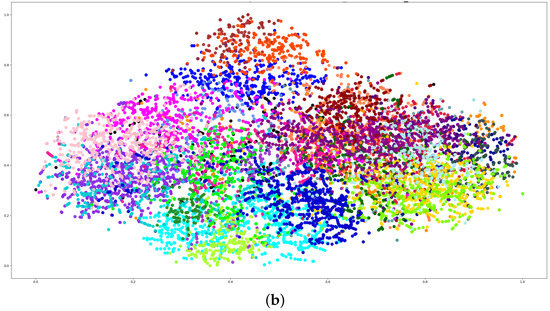 Before pooling, we extracted the 10,000 frame-level features and each frame’s pseudo-phoneme labels for visualizing the cluster effects by the t-SNE [53]. The figure above shows the distribution without clustering, and the figure below shows the distribution with clustering. The results are shown in Figure 5.