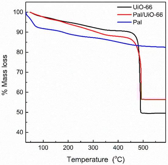 Thermogravimetric analysis (TGA) profiles of the pure UiO-66 and the composite containing palygorskite (Pal).