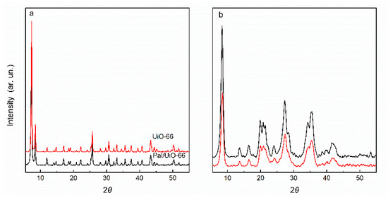 X-ray diffraction (XRD) patterns of the prepared materials, UiO-66, and the Pal/UiO-66 composite (a) and the Pal sample before and after being treated under the synthesis conditions (b).