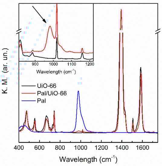 The materials were further studied using attenuated total reflection Fourier transform infrared (ATR-FTIR) spectroscopy (Figure 3). All characteristic vibrational modes of UiO-66 were detected [45,46,47]. The two intense peaks centered at 1392 and 1582 cm−1 were assigned to the asymmetric and symmetric stretch vibrations in the carboxylate group of the organic ligand. The sharp peak at ca. 1510 cm−1 was assigned to the vibration of the C−C in the benzene ring. The peaks in the region 667–745 cm−1 originated from the O–H and C–H vibrations modes of the organic linker. The vibration mode at 555 cm−1 was attributed to the Zr-(OC) asymmetric stretch. These observations agree with those in previous reports [45,46,47]. The Pal/UiO-66 presents a similar ATR spectrum to that of pure UiO-66. These results further suggest that the presence of Pal did not affect the synthesis of the MOF. The vibrational mode of the pure UiO-66 centered at 1582 cm−1 shifted to a higher wavenumber (1588 cm−1). This shift may suggest an interaction of the organic part of the MOF with the clay mineral through the carboxylate groups. In addition to the peaks related with UiO-66, the Pal/UiO-66 composite presented a broad peak in the range 970–1060 cm−1 that was not seen in the pure UiO-66 (indicated with the arrow in the inset in Figure 2). This was attributed to Pal and corresponded to the Si-O-Mg asymmetric stretching vibration [26,44,47]. Peaks in the region 1650 cm−1 were also detected in Pal/UiO-66 material, attributed to the OH bending vibration of adsorbed water on the clay structure [44]. Overall, the results of ATR verified the presence of both phases in the composite and suggested an interaction between them.