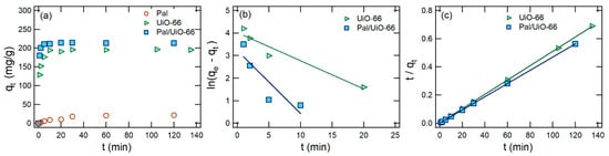 The effect of contact time on the adsorption over the pure UiO-66 and Pal materials as well as the Pal/UiO-66 composite was first evaluated. The data are given in Figure 5a. Pure Pal had low adsorption efficiency over MO. This was expected because under the conditions of the adsorption experiments, both Pal and MO were negatively charged [15,23,50], resulting in an electrostatic repulsion force generated between the adsorbent and MO. On the contrary, both pure UiO-66 and Pal/UiO-66 presented significant adsorption efficiency against MO removal (Figure 5a). Considering that the adsorption efficiency of Pal was very low compared with that of pure UiO-66, the Pal content in the composite was kept low during the synthesis process. Taking into account the adsorption kinetics using UiO-66 and Pal/UiO-66 in Figure 5a, specifically the fast adsorption process that was completed within 5 min and the high removal efficiencies, both UiO-66 and Pal/UiO-66 could effectively and quickly remove MO from water. We also highlight that the high sorption rates that led to the almost immediate achievement of equilibrium using the materials containing UiO-66 in this study (i.e., ~5 min) are not usual for this specific MOF family, which is used as adsorbents for similar substrates [35,39].