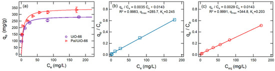 For further insights regarding the adsorption behavior, the Langmuir model was used to simulate the isotherm data (Figure 6b,c) [35,39]. As evidenced by the R2 values (0.9983 and 0.9991 for pure UiO-66 and composite material, respectively), the Langmuir model described the isotherm data well. In addition, the calculated maximum equilibrium adsorption capacity (qmax,cal = 285.7 and 344.8 mg g−1 for UiO-66 and composite material, respectively) matched the experimental values in both cases (qmax,exp = 281 and 340 mg g−1 for UiO-66 and Pal/UiO-66, respectively). The isotherms parameters are also given in Figure 6b,c.