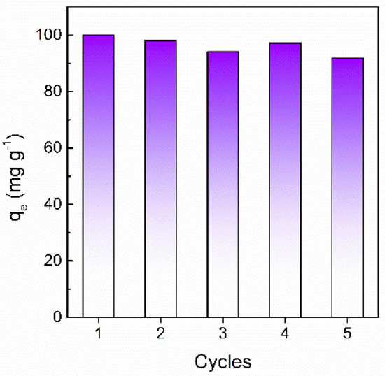 Stability is a critical parameter and a prerequisite for practical applications. UiO-66 is highly stable adsorbent for dye adsorption from aqueous media including MO [35]. The stability of the prepared composite under working conditions was tested by contacting recycling experiments. As evidenced in Figure 7, Pal/UiO-66 retained more than 91% of its adsorption efficiency after five consecutive uses compared with the fresh material. These results indicate its high potential as a reusable adsorption material.