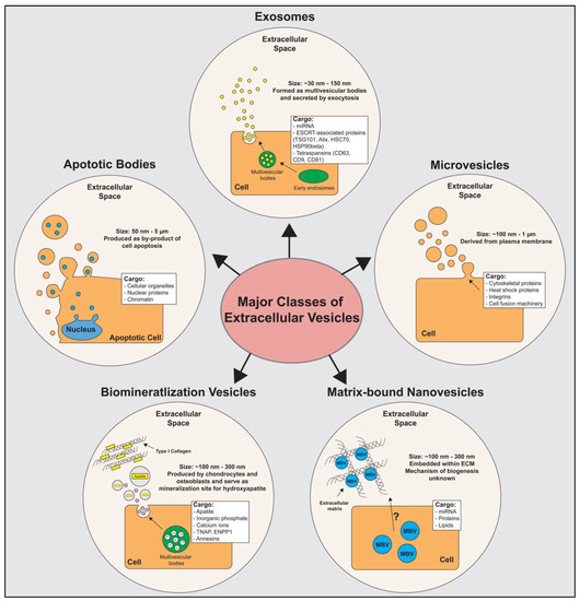 EVs are lipid-bound vesicles produced by cells and secreted into the extracellular space [10]. EVs have been shown to transfer functional cargo (including lipids, proteins, and nucleic acids) to recipient cells whereby they influence cell function and phenotype [11]. EVs have been shown to be involved in development, tissue homeostasis, and wound healing, and have also been shown to be dysregulated during disease progression [12,13]. There are five major subclasses of EVs currently identified: exosomes, microvesicles, apoptotic bodies, biomineralization vesicles, and matrix-bound nanovesicles (Figure 1). The cargo of EVs includes intraluminal proteins and nucleic acids as well as the lipids contained within the membrane of these vesicles. While all five subclasses share overlapping similarities in the types of cargo they contain, the biogenesis, size, specific cargo, and biological function of these subclasses are distinct from each other. The characteristics and functions of these five subclasses are reviewed below.