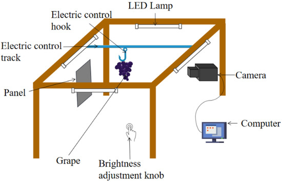 The sample comprised Red Globe grapes harvested from a local market in Wuhan, China. Imitating the industrial inspection process, we designed a grape image acquisition system (Figure 1), consisting of the following components: A panel, an electric control track, an electric control hook, a camera, a brightness adjustment knob, a computer, and four LED lamps. Image acquisition was performed between 9 a.m. and 6 p.m. in the laboratory where the temperature is approximately 25 °C. The panel was used as the background, and the electric control track transported the electric control hook, with grapes attached, to the front of the panel, while the brightness adjustment knob controlled the brightness of the chassis by controlling the lamp. The length of the LED lamp was 30 cm, the power of the LED lamp was 7.9 W, the color temperature was 6500 K when photographing, the electric control track was located in the center of the four led lights, and its vertical distance was 30 cm. The computer used a JAI AD080GE camera to take pictures of the grapes, and the resolution of the obtained images was 1024 × 768 pixels. The distance between the grapes and the camera was 35 cm, and the distance between the grapes and the background plate was 15 cm. The grapes were numbered for imaging and sugar content measuring. A saccharometer is an instrument that measures sugar content, developed according to the principle of optical refraction; it is commonly used to measure the sugar content of fruit juice. This study used a VBS2T/ATC saccharometer, which had a measurement precision (Brix%) of 0.2. In total, 228 pictures were collected using the image acquisition system; 205 were used to train the model, and the model was tested on the remaining 23.