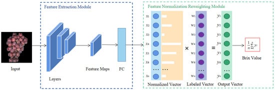 In this experiment, we propose an innovative deep learning framework FNRR, shown in Figure 4, for the non-destructive prediction of the sugar content of grapes. The framework is mainly composed of two modules: (1) The feature extraction module, which obtains the feature vector to obtain the result of the normalized vector through convolutional neural networks or transformer models, and (2) the normalized function, which produces a categorical distribution from the previous layer’s output. The entries of the labeled vector are the average labels of each category. The result was achieved through the expectation of the normalized vector and labeled vector. The process of training is described in Algorithm 1 (The proposed algorithm for training the feature normalization reweighting regression models. Epoch is the number of iterations during training).