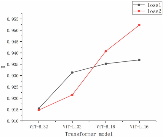 Table 2 shows that, for the two models with a patch size of 16, the proposed loss2 has higher accuracy on the test set than the traditional loss1. The dataset with the 0.8% interval achieved the best results. In comparison with loss1, loss2 increased by 0.0444 and reduced by 0.182%. ViT-L_16 obtained the best performance with the datasets with a 0.8% interval, with = 0.9599 and = 0.3841%. The effect of the transformer model is significantly better than that of the classic convolutional neural network; the increased by 0.0577, and the was reduced by 0.2220%, compared to the AlexNet model that achieved the best result for the typical convolutional neural network model (Table 3). The visual analysis corresponding to Table 3 is shown in Figure 7. In addition, visual transformer models and typical convolutional neural network models each have consistency on a specific partition. Typical convolutional neural network models achieved the best performance on the interval of 0.4%. while the visual transformer models obtained optimal results more easily for the datasets with an interval of 0.6%.