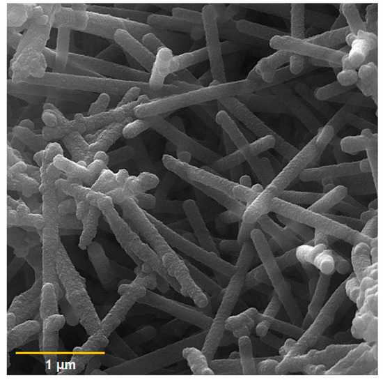 The FE-SEM image captured of the PPy NTs is shown in Figure 1, illustrating a one-dimensional nanotube structure of the PPy that is 87–150 nm in diameter and several micrometers in length, which is consistent with that reported in the previous literature [53].