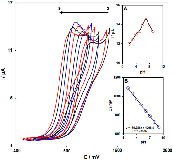 Since the selected analyte oxidation depends on the pH, the influence of the pH on the hydroxylamine oxidation was determined for the optimization of the operational conditions to reach the highest response. The electrochemical behavior of hydroxylamine on the PPy NTs/GSPE was examined in 0.1 M PBS at variable pHs of 2.0–9.0 using cyclic voltammetry (CV) (Figure 4). Reportedly, the hydroxylamine electro-oxidation on the PPy NTs/GSPE surface was higher in neutral conditions than in an alkaline medium or acidic medium (Figure 4A). Consequently, a pH of 7.0 was chosen as optimal for the hydroxylamine electro-oxidation on the PPy NTs/GSPE surface. In addition, it was discovered that the values of the peak potential shift to lower values with increasing pH, as shown in Figure 4B. Thus, the peak potential is linearly dependent on the pH, according to the following equation: Ep (mV) = −59.786 pH + 1208.6 (R2 = 0.9997). The value of the slope (−59.786 mV/pH) was very close to the theoretical value (−59 mV/pH), indicating that the same electron and proton numbers participate in the electrochemical oxidation process.