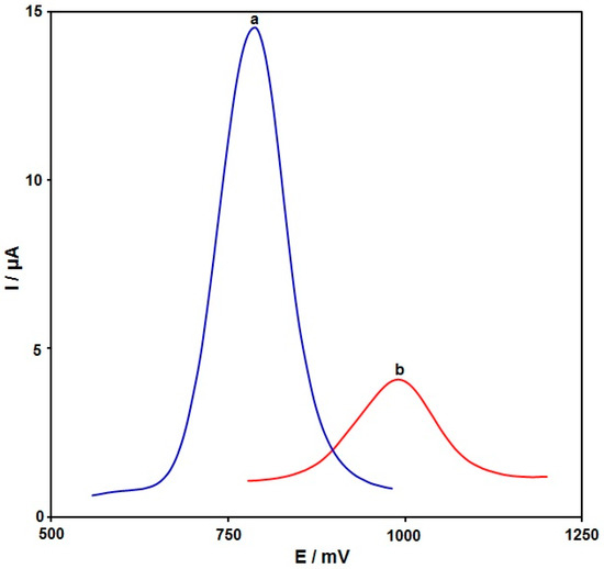 The electrochemical behavior of 100.0 μM hydroxylamine in the buffer solution (pH 7.0) was illustrated by using differential pulse voltammetry (DPV) techniques on the surfaces of bare GSPE (Figure 5, curve b) and the PPy NTs/GSPE (Figure 5, curve a). The anodic peak potential was approximately 1000 mV for the hydroxylamine oxidation on the bare GSPE, while it was approximately 790 mV on the PPy NTs/GSPE. On other hand, the GSPE exhibited a minimal current (4.0 µA), and the PPy NTs/GSPE exhibited an elevation in the oxidation current (14.5 µA). Accordingly, the greatest electrocatalytic impact on hydroxylamine oxidation was on the surface of the PPy NTs/GSPE as opposed to the bare GSPE, which was caused by increasing the simplification of the electron transfer process.