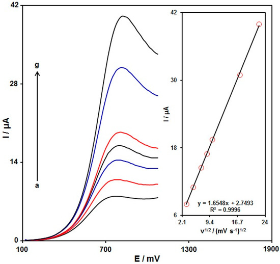 LSV recorded for the PPy NTs/GSPE in 0.1 M PBS at pH = 7 with 100.0 μM hydroxylamine at variable scan rates. Nos. a–g: 10, 25, 50, 75, 100, 300, and 500 mV/s, sequentially. Inset: variation of the anodic peak current versus ν1/2.