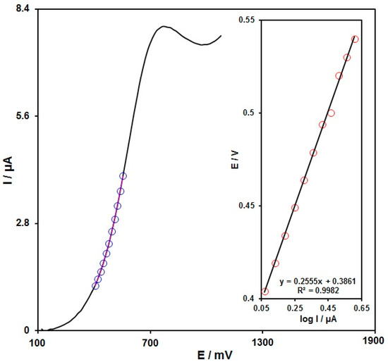 The rate-determining step was explored via the Tafel plot (Figure 7) according to the rising domain of the current–voltage curve at a scan rate of 10 mV/s. This section of the voltammogram (or the Tafel region) is influenced by electron transfer kinetics between the hydroxylamine and the PPy NTs/GSPE surface. The Tafel slope was 0.2555 and the charge transfer coefficient (α) was 0.77; thus, a two-electron transfer procedure can be discerned in the rate-determining step for the electro-oxidation of hydroxylamine.