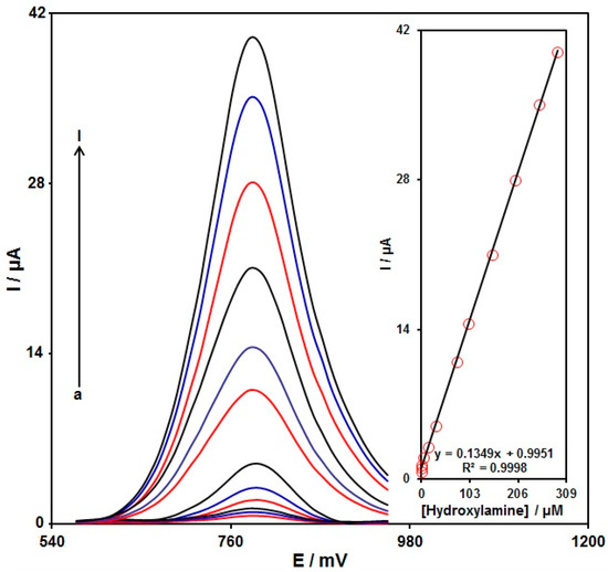 DPVs recorded for the PPy NTs/GSPE in 0.1 M (pH 7.0) with variable hydroxylamine concentrations. Nos. a–I: 0.005, 0.07, 1.0, 5.0, 15.0, 30.0, 75.0, 100.0, 150.0, 200.0, 250.0, and 290.0 µM of hydroxylamine. Inset: Plot of the electrocatalytic peak current as a function of the variable hydroxylamine concentrations (0.005–290.0 µM).