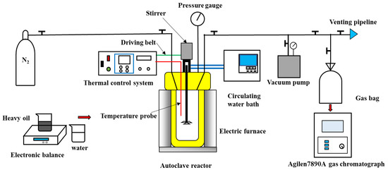 The setup of the aquathermolysis experiments is detailed in Figure 1. The aquathermolysis experiments were performed in a closed autoclave reactor (Anhui Kemi Machinery Technology Co., Ltd., Hefei, China). The 300 mL reactor was made of Hastelloy C276, and its maximum operating pressure and temperature can achieve 34.5 MPa and 500 °C, respectively. A thermal control system was used to control the temperature of the autoclave reactor by an electric furnace and displayed the temperature data transmitted by an internal temperature probe in real time. A pressure gauge (Jasco 25-1009-SW-02L-400BR-X6W) with a range of 0–40 MPa was used to monitor the pressure during each experiment. The top of the reactor was equipped with a magnetic stirrer with stirring fluid, and a circulating water bath was provided to prevent the magnetic stirrer from being damaged at high temperatures. A vacuum pump was applied to empty the air in the system in advance to improve the accuracy of the experiments. Before each experiment, a certain amount of heavy oil and water were weighed by an electronic balance, and nitrogen was used as an eluent gas. After each experiment, 500 mL gas bags were used to collect the gas products. A gas chromatograph (7890A, Agilent CO., Ltd., Santa Clara, CA, USA) equipped with a flame ionization detector (FID) and sulfur chemiluminescence detector (SCD) was used to analyze the composition of gas products.