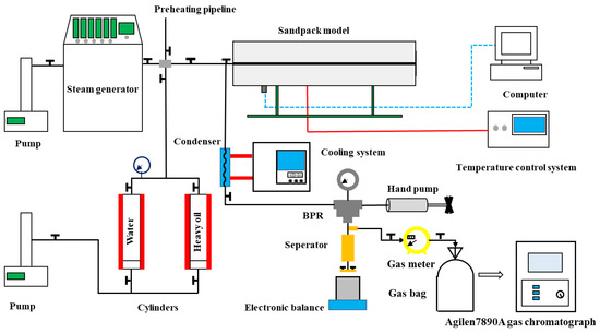 The setup of the one-dimensional CSS experiment is shown in Figure 2. The CSS experiment was performed in a one-dimensional sandpack model (3.8 cm in diameter and 48 cm in length) made of Hastelloy C276. Its maximum operating pressure and temperature were 50 MPa and 450 °C, respectively. The pump was used to inject water and heavy oil into the sandpack model. Its minimum injection rate can reach 0.01 mL/min. The steam generator was used to heat the water provided by a pump to the specified injection temperature, and its maximum working pressure and the temperature reached 35 MPa and 450 °C, respectively. A temperature control system was used to control the sandpack model temperature by six belt heaters (power 3500 W) surrounded by the sandpack surface, and a pressure probe together with a computer was used to monitor the sandpack pressure. The products were cooled to 60 °C through the cooling system and condenser to avoid damage to the back-pressure regulator (BPR). The BPR, together with a hand pump, was used to adjust the sandpack model pressure. The gas–liquid separator separated the products into the liquid and gas phases. An electronic balance and a gas meter were used to measure the mass of the liquid and gas volume. The gas was collected in 500 mL gas bags and analyzed by the gas chromatograph.