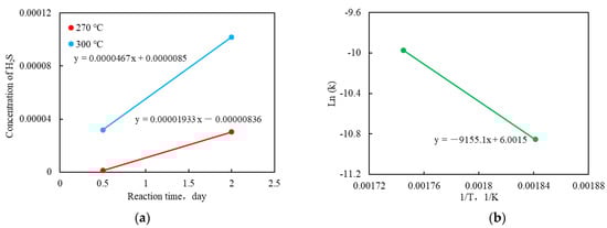 According to the experimental data of the aquathermolysis experiments, the activation energy and frequency factor were estimated by a Kapadia kinetics model [15]. As shown in Figure 3a, the reaction time had a linear relation with the concentrations of H2S [24]. The reaction time and the concentration of H2S were fitted, with the slope of the regression lines showing the values of reaction rates (k) at different temperatures. It can be seen from Figure 3a that the reaction rates at 300 °C and 270 °C are 0.0000467 and 0.00001933, respectively. Figure 3b shows the relationship between the reaction rates (k) and temperatures (T). The corresponding kinetic parameters (activation energy and frequency factor) were obtained according to the slope and intercept of the interpolation line (Figure 3b), which are 76.12 kJ/mol and 404.03 1/day, respectively.