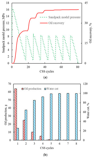 The results of the one-dimensional CSS experiment are shown in Figure 4. As shown in Figure 4a, the sandpack model pressure increased during the steam injection. Once the target pressure was reached, the soaking began, and then the sandpack model pressure tended to be stable. When the soaking was completed, the pressure decreased at 1 MPa/h. In addition, as the CSS cycle increased, the oil production gradually dropped while the water cut gradually increased (Figure 4b). The oil recovery at the end of the eighth cycle reached 40.10% (Figure 4a).