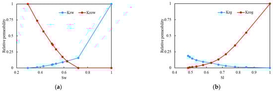 Relative permeability curve: (a) the oil–water relative permeability curve; (b) the gas–liquid relative permeability curve.
