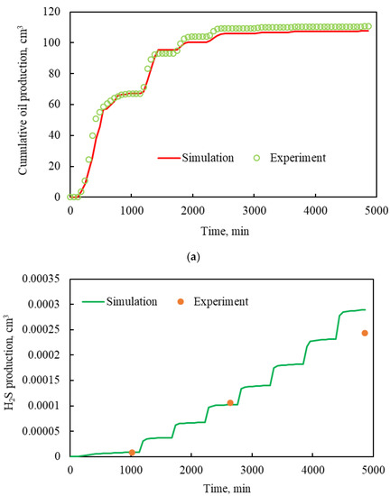 Matching of measured and simulated results: (a) cumulative oil production; (b) H2S production.