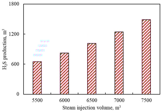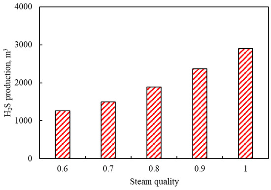 Figure 10 shows the effects of steam quality on H2S production. It can be found from Figure 10 that the production of H2S has an increasing trend with the increase in steam quality. The maximum H2S production is 2895 m3 when the steam quality is 1. This is because the steam with higher quality has a high latent heat of vaporization and a large specific volume. When the steam was injected into the reservoir, the steam with a higher steam quality accelerated the aquathermolysis reaction and increased the H2S production.