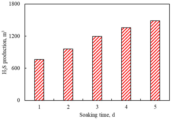 Figure 11 shows the effects of soaking times (1–5 days) on H2S production. As shown in Figure 11, the production of H2S increases gradually with the increase in soaking time. The reason for this trend is that with the increase in soaking time, the time of aquathermolysis reaction increases. Therefore, the extent of the aquathermolysis reaction is gradually deepened. However, the increasing degree of H2S production gradually decreases with the increase in soaking time after the third cycle. The reason is that the oil saturation near-wellbore decreases after the continuous aquathermolysis reactions.