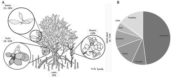 Most widely used parts of the plants (A) and most common preparations (B) in traditional medicine. Avicennia marina was illustrated by Inês Simão.