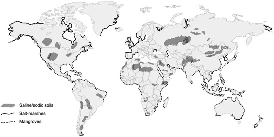 World distribution of halophyte habitats according to soil type (based on [25,26]).
