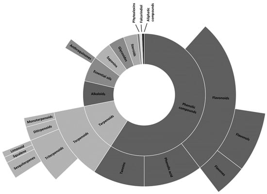 Primary metabolites of halophytes, such as carbohydrates and lipids, are regarded with interest as supplements or nutraceutics. Secondary metabolites, such as terpenes and phenols, have antioxidant and anti-inflammatory antitumoral and antimicrobial activities [35] and underlie many of the applications of halophytes in traditional medicine [57]. Some compounds modulate and stimulate the immune system, lower the risk of heart diseases, control body weight and blood sugar levels, and can even act as antiaging agents [58,59,60,61,62,63]. Antimicrobial activity is most commonly associated with phenolic acids, flavonoids and tannins (Figure 3). Terpenoids are the second most abundant group of bioactive molecules, followed by alkaloids, essential oils, glycosides and steroids.