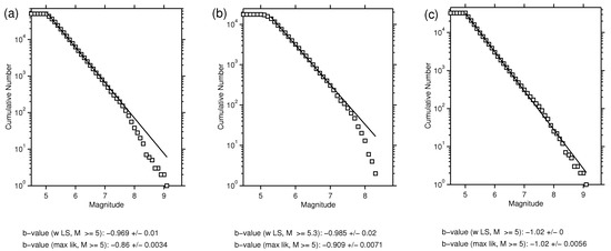 Frequency–magnitude diagram for earthquakes in the GCMT catalog. Estimated b-values with least squares (labeled ‘w LS’) and the maximum likelihood (labeled ‘max lik’) method are also shown at the bottom of each panel. (a) For the whole study period (1976–2022), (b) for the period 1976–2000, and (c) for the period 2001–2022, using the ZMAP software [93]. The number of earthquakes is counted in bins of 0.1-magnitude-unit width.