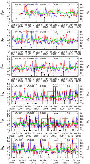 in order to follow the time evolution of , this value is assigned to the -th EQ in the EQ catalog. As stated in the Introduction, the number W is chosen [65] to correspond to the number of EQs that, on average, occur during the average lead time of an SES activity that ranges from a few weeks to months (see Chapter 7 of Ref. [4]), i.e., a period of a few months.