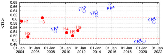 At this point, we need to incorporate the results of Varotsos et al. [86] that showed the interconnection of magnitude time series correlations with the minima of the fluctuations of the order parameter of seismicity and SES. Since References [13,86] were prepared almost simultaneously, these results have not been incorporated in the analysis of global seismicity [13]. Specifically, Varotsos et al. [86] showed, among others, that during the observation of the fluctuation minimum in the regional study of Japan, the DFA exponent (obtained from the DFA, see Section 2.3, of segments of consecutive 300 EQs) reveals long-range correlations (cf. this fact was related to the SES properties and its generation mechanism [73,75,88]). Hence, studying the DFA of the magnitude time series should provide additional information on the quality of the ‘precursory’ fluctuation minima. For this reason, apart from , we also calculated (since is the largest window used in the NTA of global seismicity) and plot with the green broken line the quantity in Figure 4. A close inspection of this Figure, together with the results shown in Table 1, indicates that for the ‘presursory’ fluctuation minima that precede the EQs lie in the narrow range 0.51–0.61. A comparison of these values with those obtained for the previous six false alarms eliminates four of them (see the bold face numbers in the last column of Table 1) leaving only FA1 and FA6 still as false alarms. To visually affirm this property, we depict in Figure 9 the values of on the date of for all the ‘presursory’ fluctuation minima of Table 1. Thus, the present study reveals that when combining Conditions (10) and (11) with the additional condition: