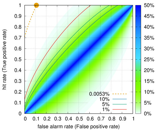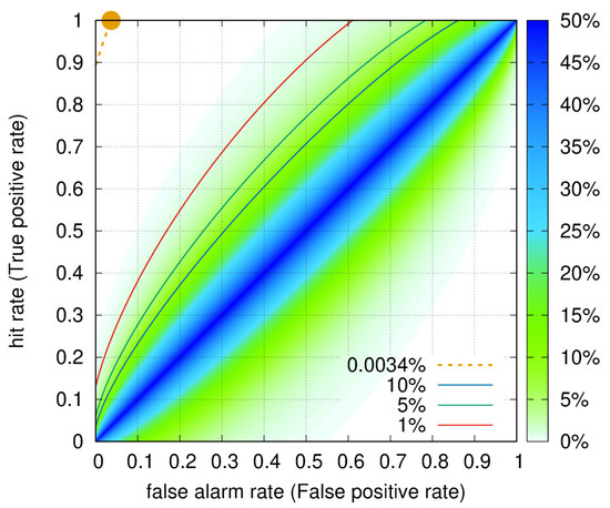 The area A under the curve (AUC) in the ROC plane is what determines the statistical significance of an ROC curve [119]. As it was shown in Reference [119], , where U follows the Mann–Whitney U-statistics [120]. In 2014, the statistical significance of ROC curves was visualized [121] using the envelopes of confidence ellipses, called k-ellipses, which cover the entire ROC plane. Using A, one can measure the probability p to obtain an ROC curve passing through each point by chance.