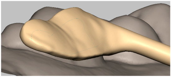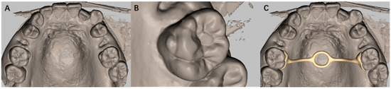 A patient presented with a large Carabelli cusp on the first upper molar (Figure 4A,B). A TPA was necessary for anchorage control and vertical control. However, a traditional TPA with a metal band was not suitable, because the prefabricated band was difficult to insert. Digitized dental models were acquired by scanning the casts. As such, the clinician recommended a 3D TPA (Figure 4C), which neatly fitted the surface of the Carabelli cusp.