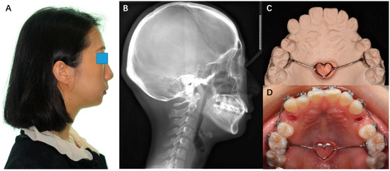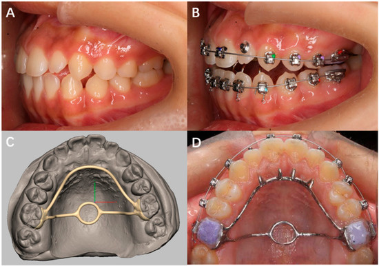 A patient was diagnosed with skeletal class II and high-angle malocclusion (Figure 3A,B). A TPA was needed to control the vertical height of the molars. The doctor chose a 3D TPA (China patent no. ZL 2017 2 0580517.1) for the patient. Digitized dental models were acquired by scanning the casts. The bar of the 3D TPA was designed to be heart-shaped according to the patient’s preference (Figure 3C,D).