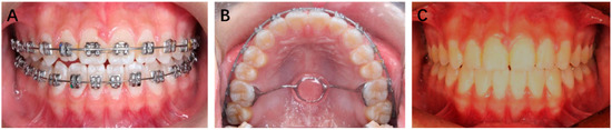 (A) Mild open bite in the anterior teeth; (B) a 3D TPA bonded on maxillary first molars; (C) corrected open bite.