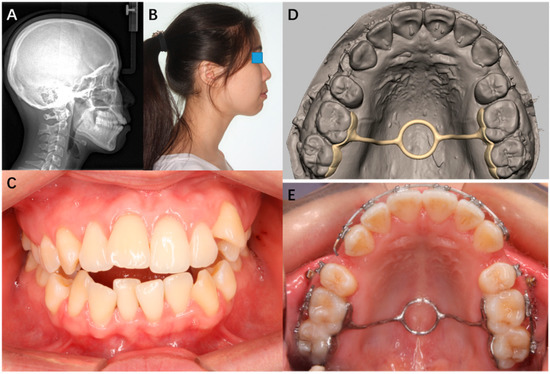 A patient was diagnosed with a high MP-FH (Figure 6A), a protruded profile (Figure 6B) and a conspicuous open bite (Figure 6C). Both the first and second molars should be intruded to correct the malocclusion. Digitized dental models were acquired by scanning the casts. The doctor designed a 3D TPA (Figure 6D,E), connecting the first and second molars, to intrude both simultaneously and prevent the molars from inclining buccally; this was combined with mini implant anchorages.